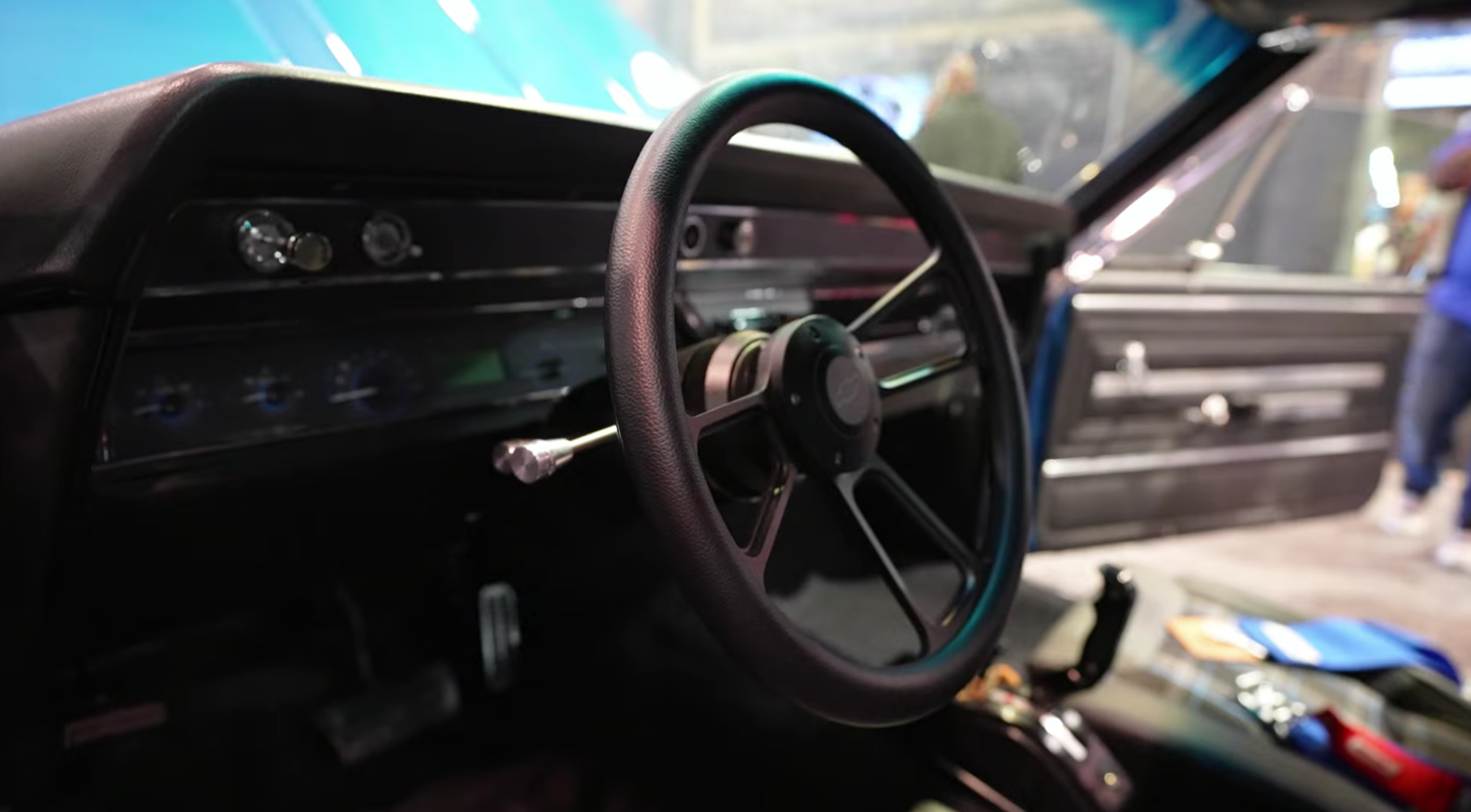 Inside, the Chevelle retains much of its original character. The dash and radio remain factory style, with wiring hidden beneath to keep the cabin clean. The automatic transmission is manually shifted through the gears, eliminating electronic controls for simplicity.