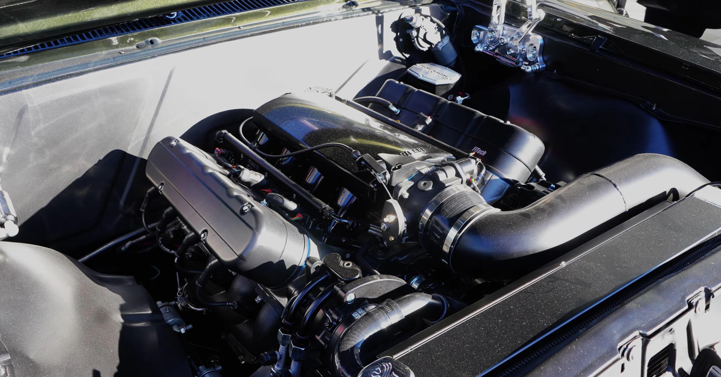 The LS is dressed with FiTech components to clean up the look, hiding coil packs and keeping the engine bay intentional and refined.